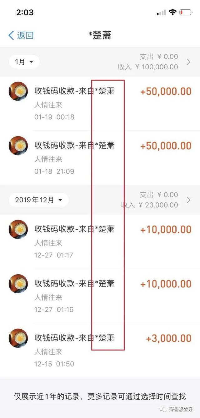 还有转账截图,可以看到付款人写着楚萧,从去年12月到今年一共转给女方12万3千元。
