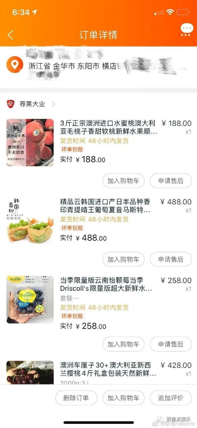 可以看到一批贵价水果,收货地是横店。