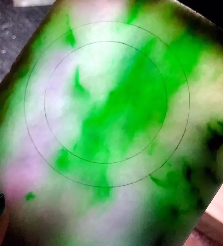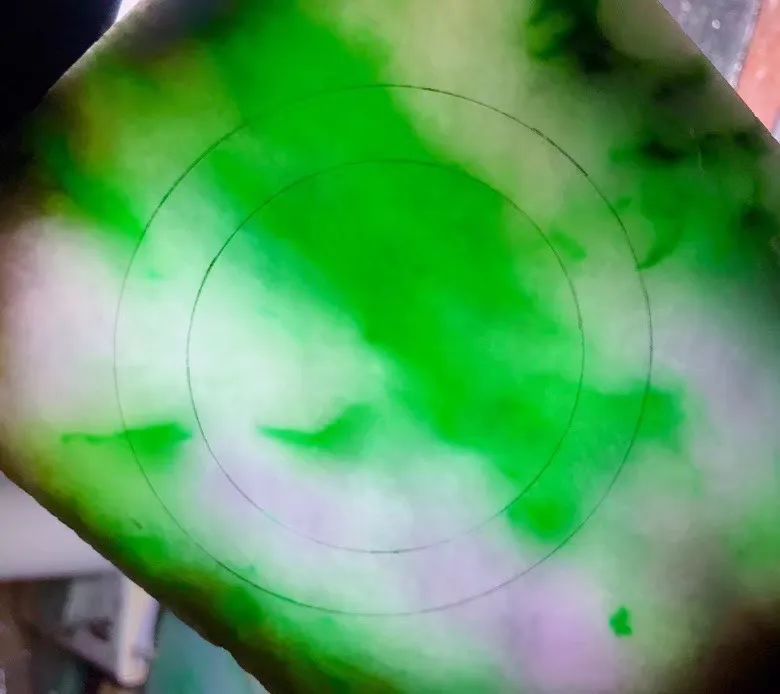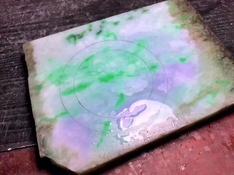 原来是一块8000块的蒙头料切涨了,我看它种水虽然不出色,但是绿色却很鲜艳,还有似浓似淡的紫罗兰春色。自古以来“紫为贵,绿为尊”,就光这些绿就已经涨了,何况这还切出了春带彩。之后便向货主小千价讨来了这一块片料。
