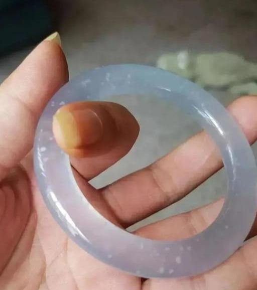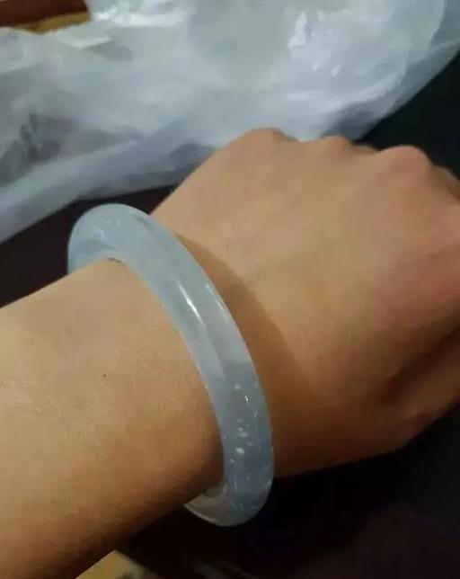 手镯位压灯观察,原 石肉质细腻、通透水润,透明清澈的水头,映衬着玉 石内部星星点点的白棉,种里面的白色絮状物,如同被凝固的飘扬的雪花一样,因此被业内称为“雪花棉”。雪花棉颜色纯白,状态轻盈,疏密有致,在翡翠内部漂浮,棉、种相融,润泽剔透.这正是雪花棉的独特之处。