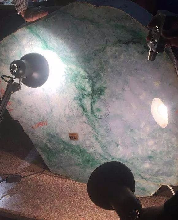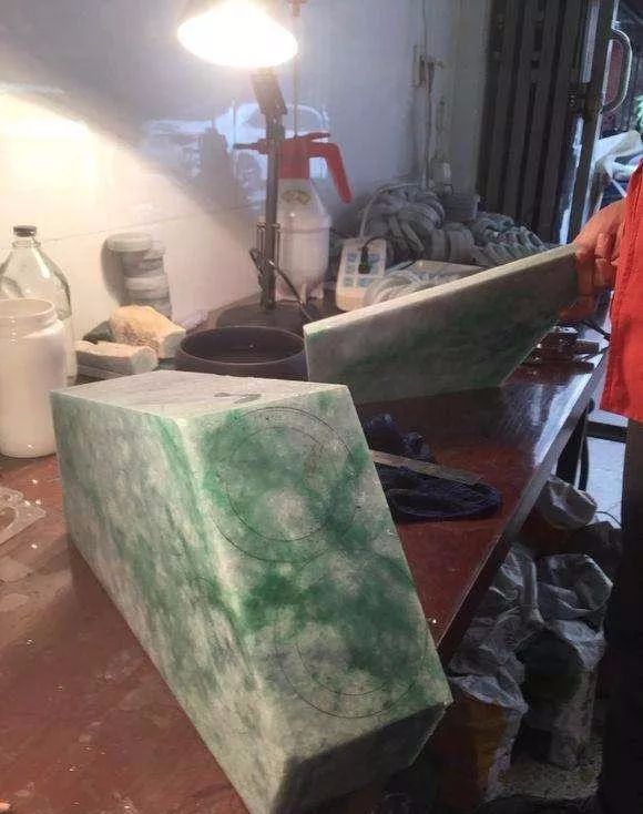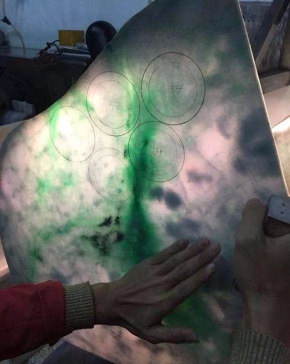 原石体积很大,切面全部画上了手镯圈口,满满当当,看着就叫人激动!