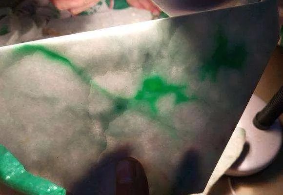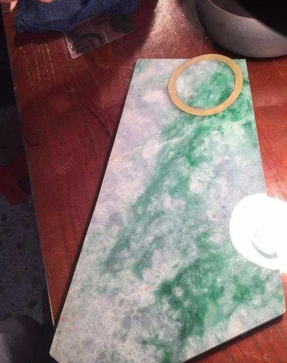 切下里的片料随便一打灯就是通透,冒着鲜艳娇翠的绿光,“种不够,色来凑”,即使种水占了下风,但只要有绿,切出的手镯价值就不会低,果断取镯!