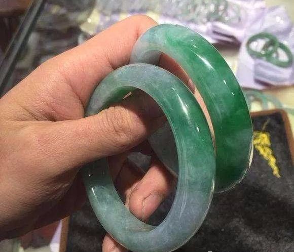 因原石比较大,以可切很多片,而且裂纹也没有完全进去,怎么说也是数百支只阳绿翡翠手镯。